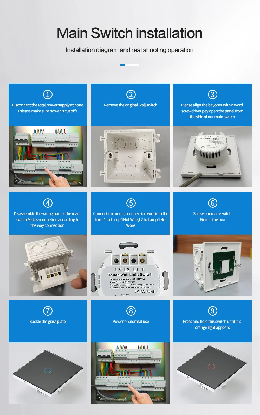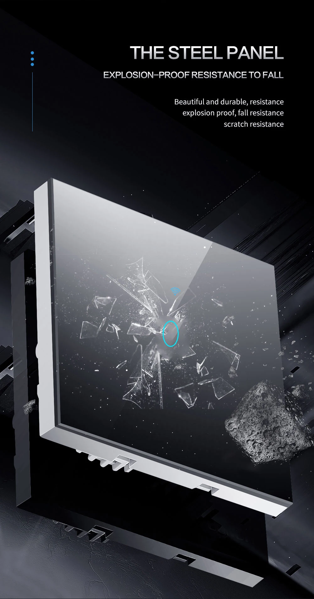 7.Safety and Certification:The wall switch adopts premium materials, such as fire-resistant shell, phosphor bronze connects and advanced PC+TEMPERED GLASS, can provide fire prevention, overload protection to protect your family.