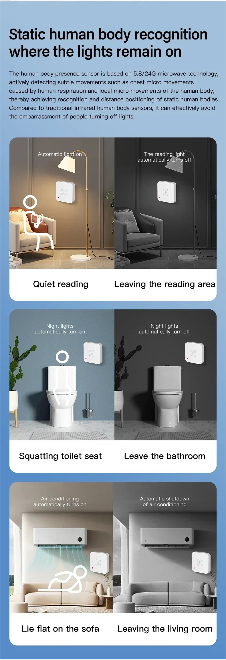 The human body presence sensor is based on microwave technology ,actively detecting subtle movements such as chest micro movements caused by human respiration and local micro movements f the human body, thereby achieving recognition and distance positioning of static human bodies.Compared to traditional infrared human body sensors,it can effectively avoid the embarrassment of people turning off lights.