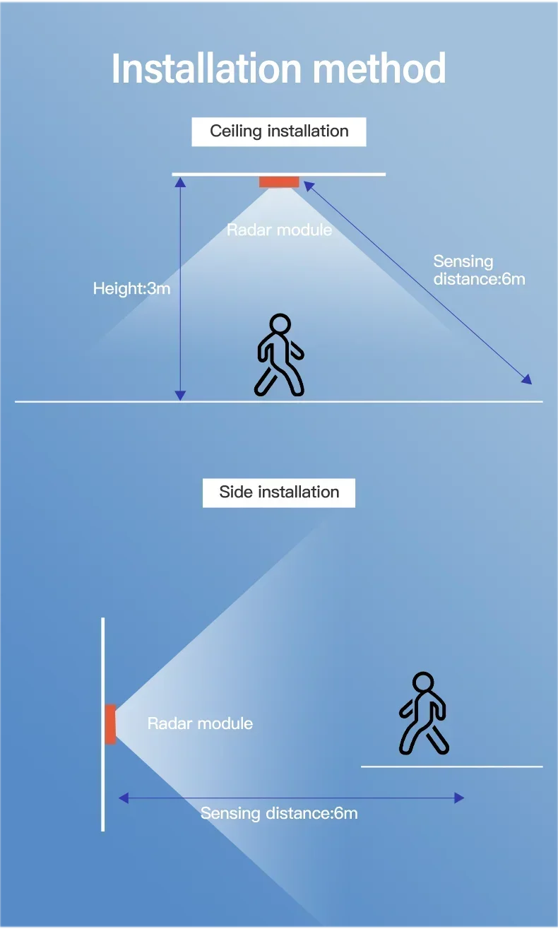 A: 1. Please ensure that the WiFi signal at the installation location is good. 2. Cannot be installed on metal as it can interfere with radar signals. The detection area for installation is a conical airspace with a length of 6 meters and an angle of 90 degrees.